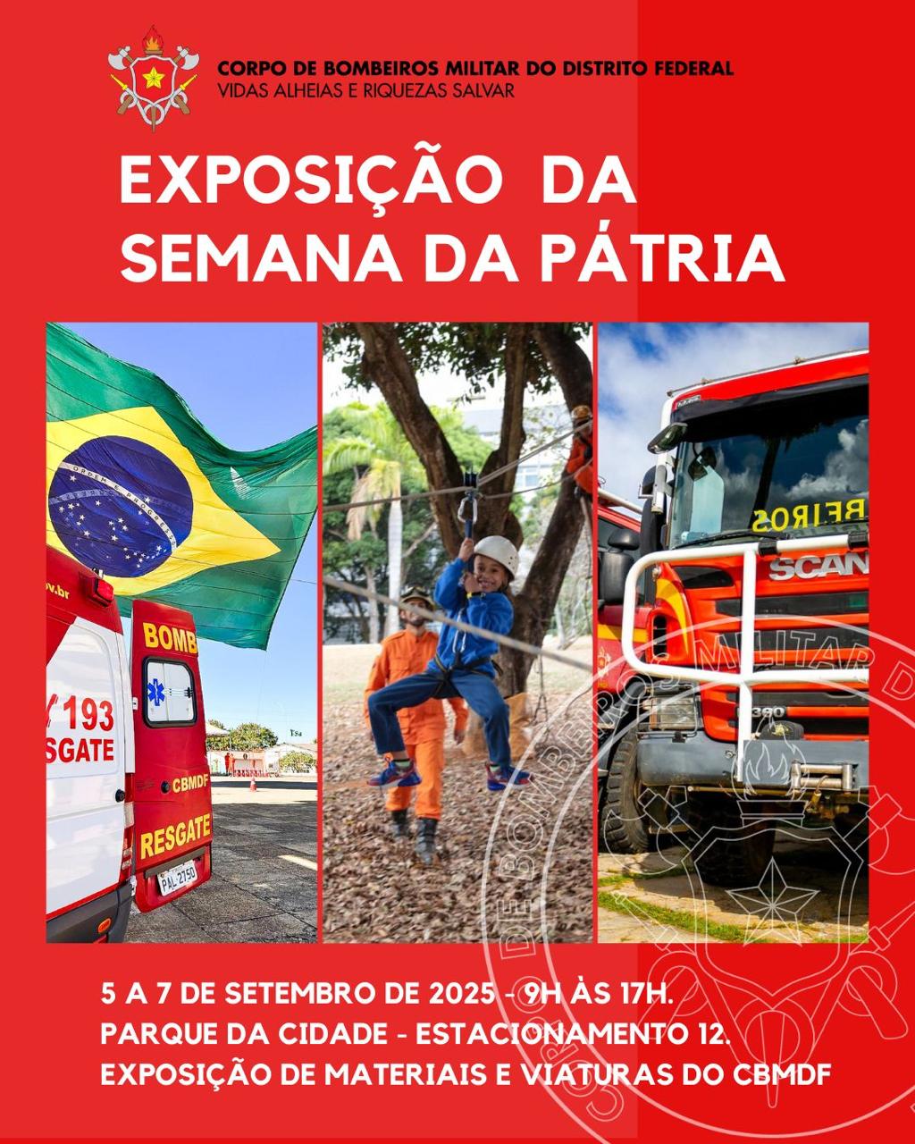 O Corpo de Bombeiros Militar do Distrito Federal (CBMDF) integra a programação da Semana da Pátria com ações que aproximam a corporação da população e reforçam sua missão em prol da segurança da comunidade. Nos dias 5, 6 e 7 de setembro, a instituição participa da Exposição da Semana da Pátria, no Estacionamento 12 do Parque da Cidade, ao lado das Forças Armadas e de outras forças de segurança pública.