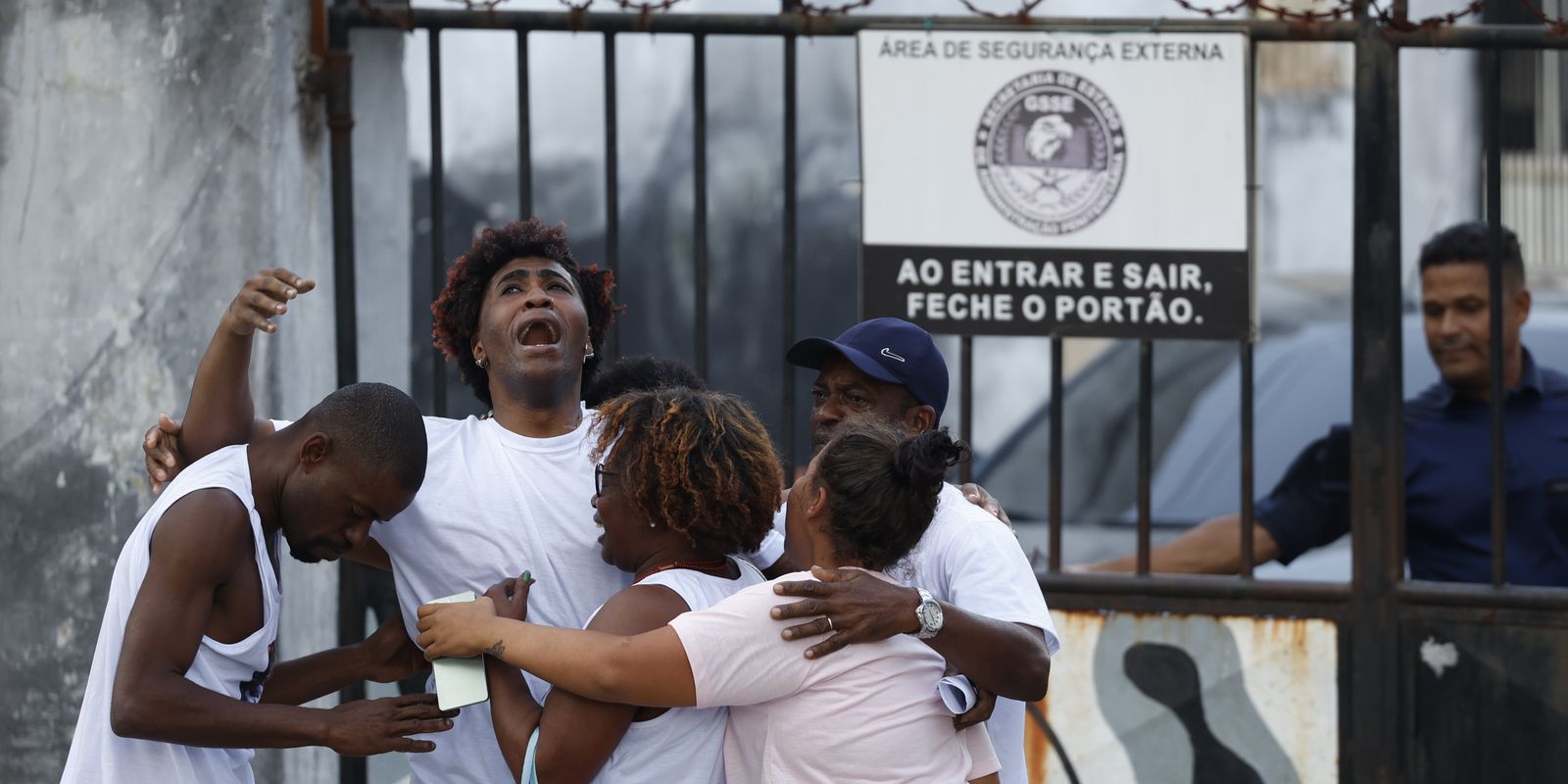 Rio de Janeiro (RJ) 25/07/2024 – Carlos Vitor Guimarães abraça sua família no lado de fora do Presídio Evaristo de Moraes. O jovem negro de 25 anos, morador de São Gonçalo, esteve preso durante um ano e meio ao ser condenado por roubo de carga apenas com reconhecimento por foto, e está absolvido pelo Superior Tribunal de Justiça após pedido da Defensoria Pública do Estado.  Foto: Fernando Frazão/Agência Brasil