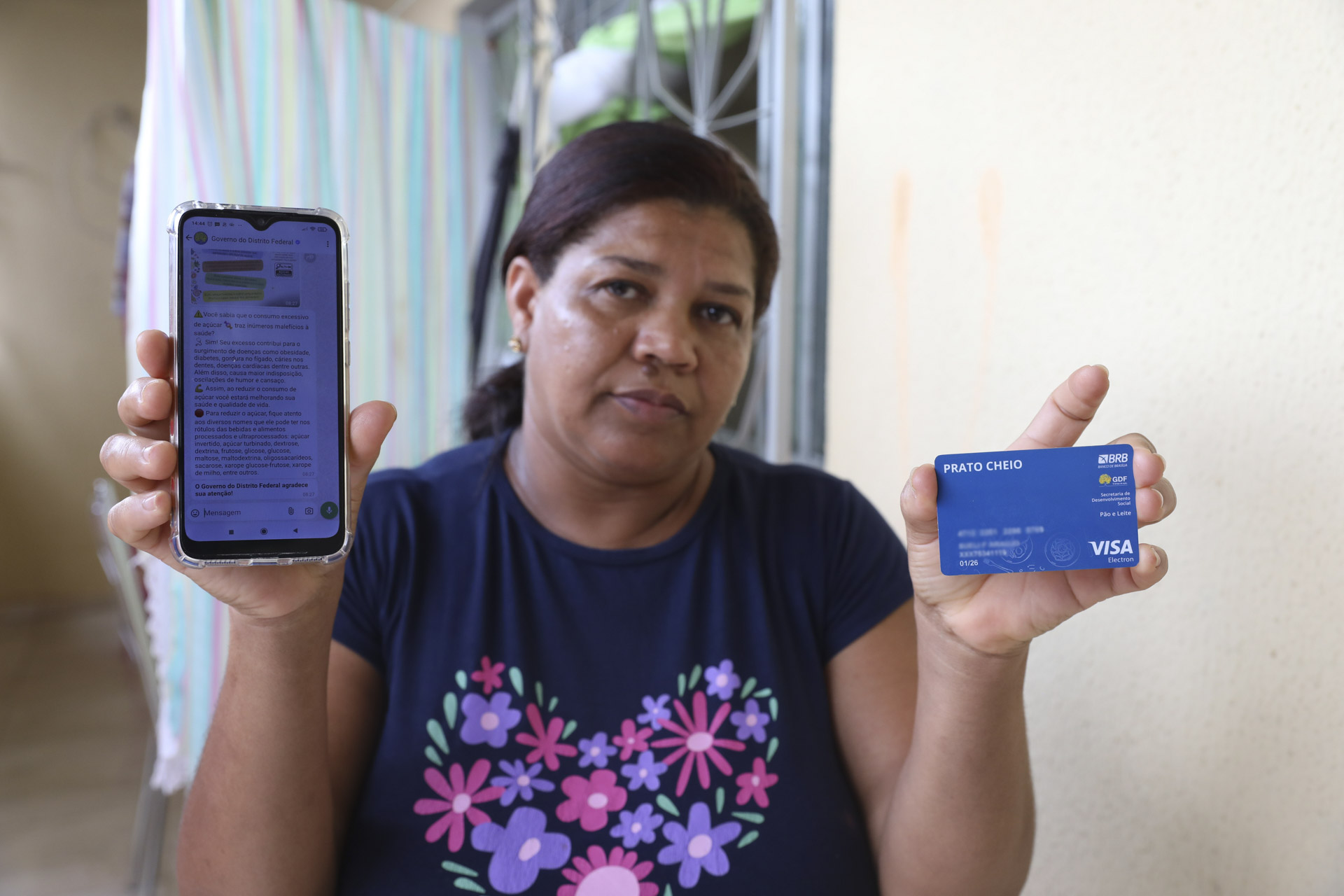 Beneficiária do Cartão Prato Cheio, Sueli Flores diz que as mensagens enviadas pelo WhatsApp oficial ajudam a escolher alimentos e a economizar | Foto: Joel Rodrigues/Agência Brasília