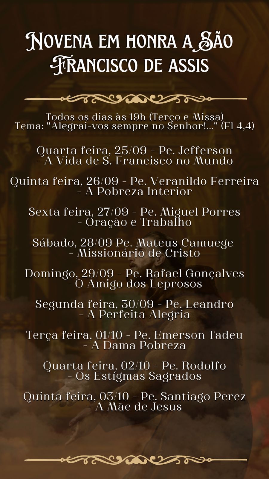 A Paróquia de São Francisco, situada no Setor Habitacional Tororó, no Jardim Botânico, deu início na última quarta-feira (25) à tradicional novena em memória ao seu padroeiro, São Francisco de Assis. As celebrações acontecem diariamente às 19h30 e se estenderão até o dia 3 de outubro, véspera do dia dedicado ao santo, culminando com uma missa solene.