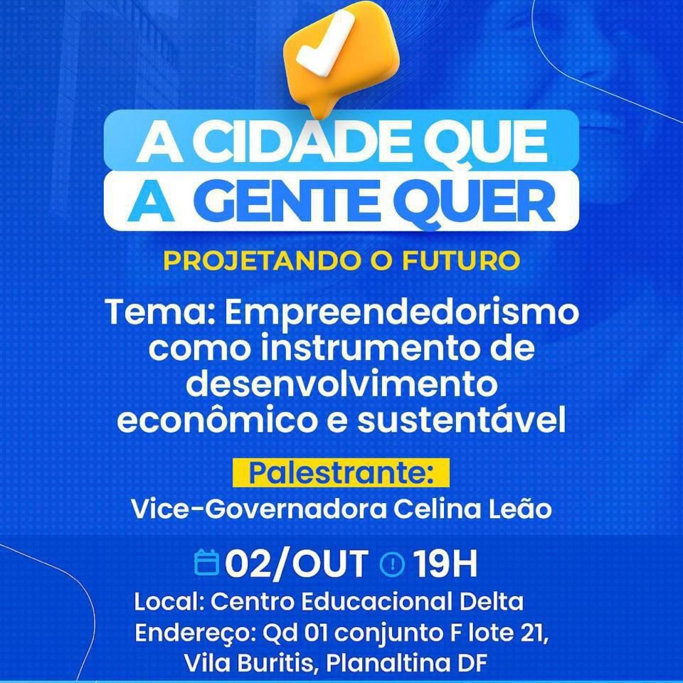 O evento será realizado no Centro Educacional Delta, a partir das 19h, com entrada aberta ao público. A programação inclui a palestra “Empreendedorismo como instrumento de desenvolvimento econômico e sustentável”, ministrada pela vice-governadora do Distrito Federal e presidente do Progressistas-DF, Celina Leão.